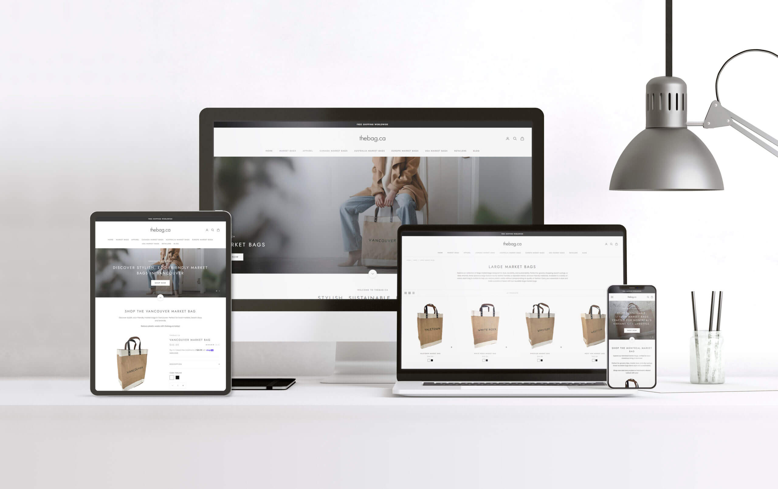 Launching an ecommerce site with 100+ products is no small feat. TheBag.ca offered an extensive range of sustainable market bags—from Vancouver neighbourhood-inspired designs to international city collections—plus apparel and accessories. Each product needed detailed descriptions, optimized imagery, and a seamless shopping experience.